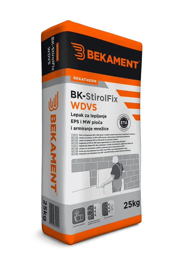 Za lepljenje termoizolacionih ploča od stiropora na čvrste fasadne površine, umetanje armaturne mrežice i izravnavanje celokupne fasadne površine, kao i za lepljenje tabli mineralne vune. BK-StirolFix WDVS se koristi kao lepak za lepljenje termoizolacionih ploča u okviru Bekatherm Standard, odnosno za lepljenje MW ploča u okviru Bekatherm Prestige termoizolacionog sistema.
